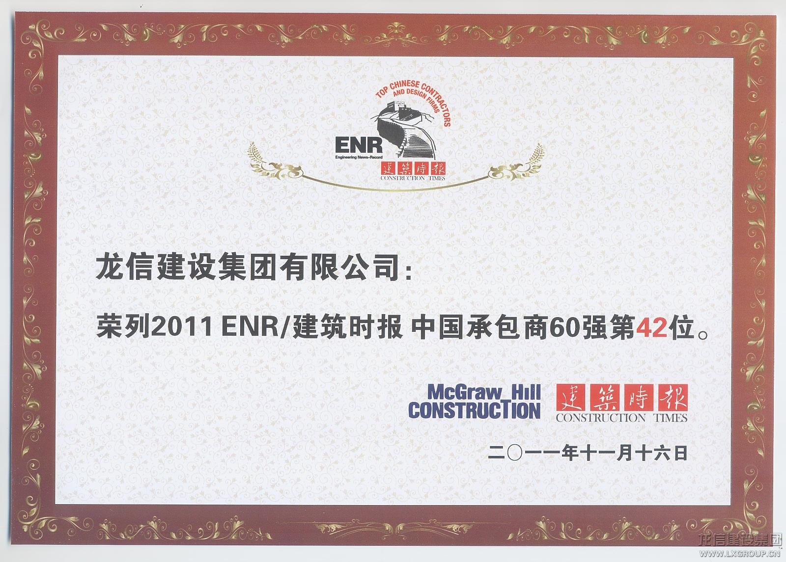 2011年ENR/建筑時報“中國承包商和工程設計企業雙60強”在滬揭曉。60家承包商及60家工程設計企業入選2011年中國工程界的“最強陣容”,龍信集團連續三年榮登“ENR中國承包商企業60強”,并以比去年提升11名的成績榮登最具成長性企業。