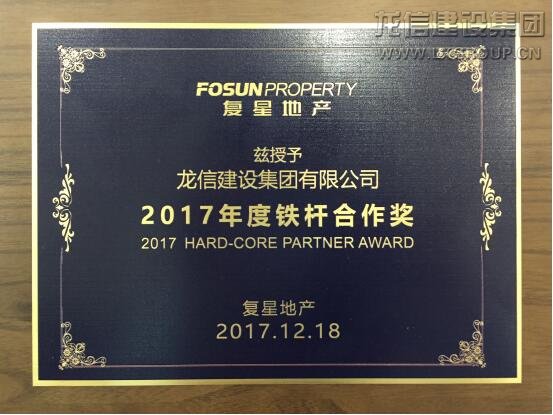 12月18日,復星地產2017年度“凝心聚力,共創(chuàng)未來”合作供應商大會在上海萬達瑞華酒店勝利召開。龍信集團被復星地產授予“2017年度鐵桿合作獎”榮譽稱號,龍信二分公司二部經理施建昌應邀出席頒獎大會并領獎。